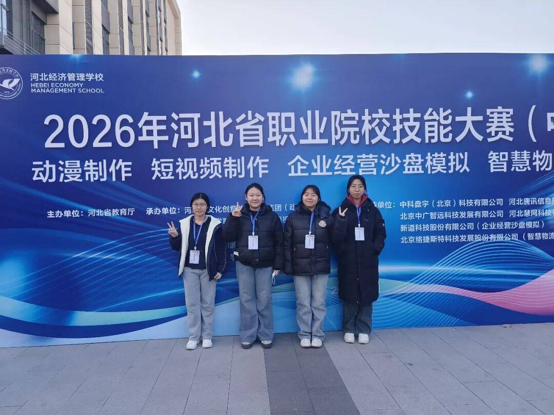 2026年1月9日,2026年河北省职业院校技能大赛中职组短视频制作赛项在石家庄河北经济管理学校成功举办。该赛项由河北省教育厅主办、河北省艺术职业教育集团和河北经济管理学校承办,吸引了来自全市的74支代表队参赛。经过激烈角逐,保定市女职中专由刘境峰老师指导的尹浛樾、于圣洁、孙诗琪、康杜梦四名同学凭借扎实的理论知识和专业技能,经过4小时的拼搏,荣获该赛项团体二等奖的好成绩。