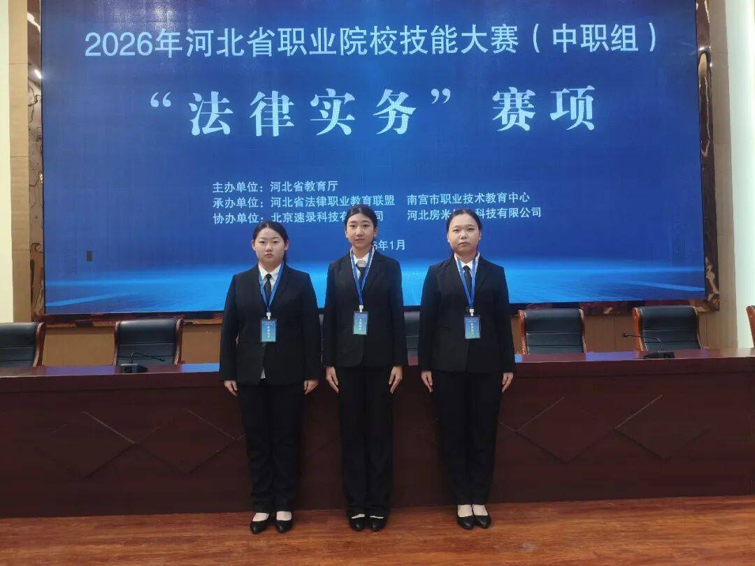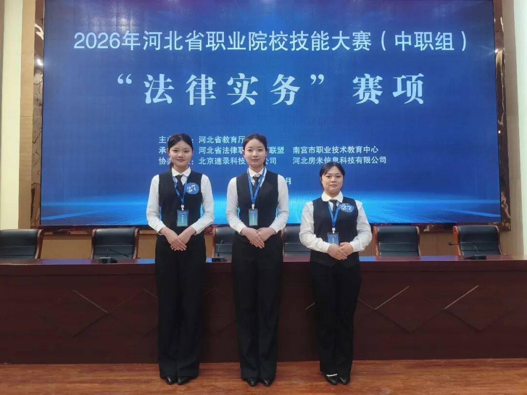 2026年1月10日,2026年河北省职业院校技能大赛法律实务赛项在邢台市南宫市职业技术教育中心成功举办。该赛项由河北省教育厅主办、河北省法律职业教育联盟和南宫市职业技术教育中心承办,吸引了来自全省的28支代表队参赛。经过激烈角逐,保定市女职中专由周佳音、赵兰老师指导的赵耿恩欣、崔伊扬、李珈瑶三名同学荣获该赛项团体一等奖,王依冰、赵梦涵、张苗艺三名同学荣获该赛项团体三等奖的好成绩。