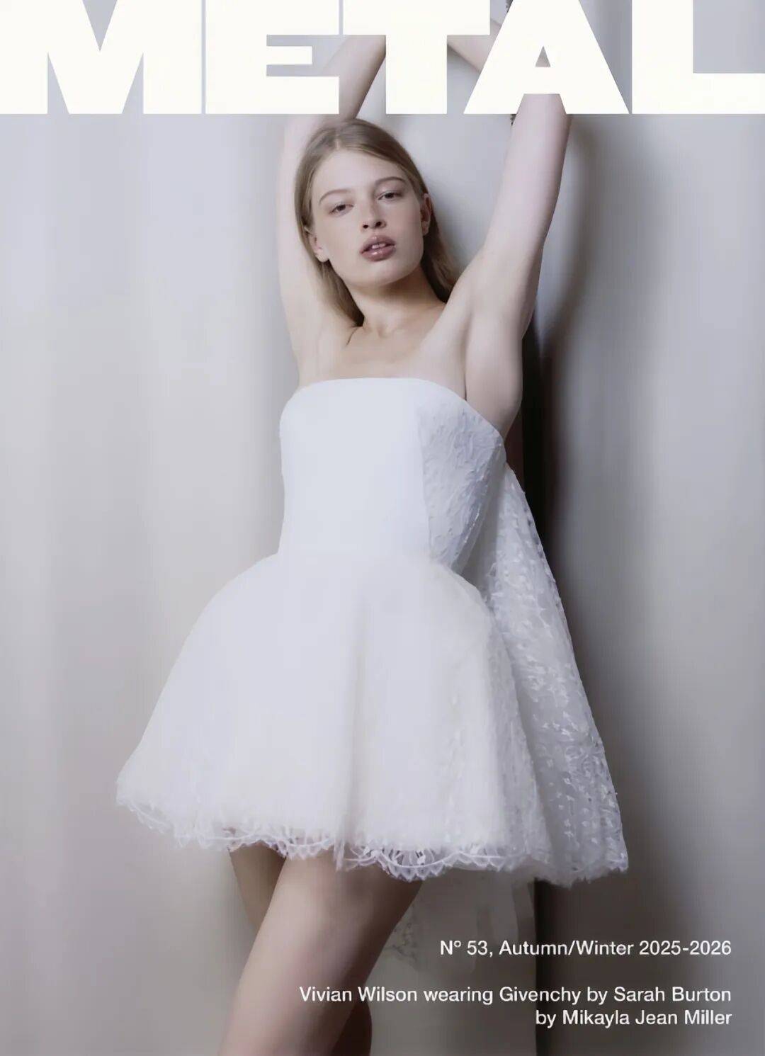 去年 11 月,她身穿纪梵希白色裙装,登上《METAL》2025-2026 秋冬刊封面。▼