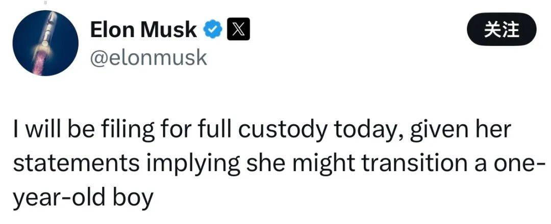被戳肺管子的老马,用 10 G信号接收到明讽后,一下子暴跳如雷。他立刻回应道:“鉴于她暗示可能会让一个一岁男孩变性,我今天将申请获得完全监护权。”