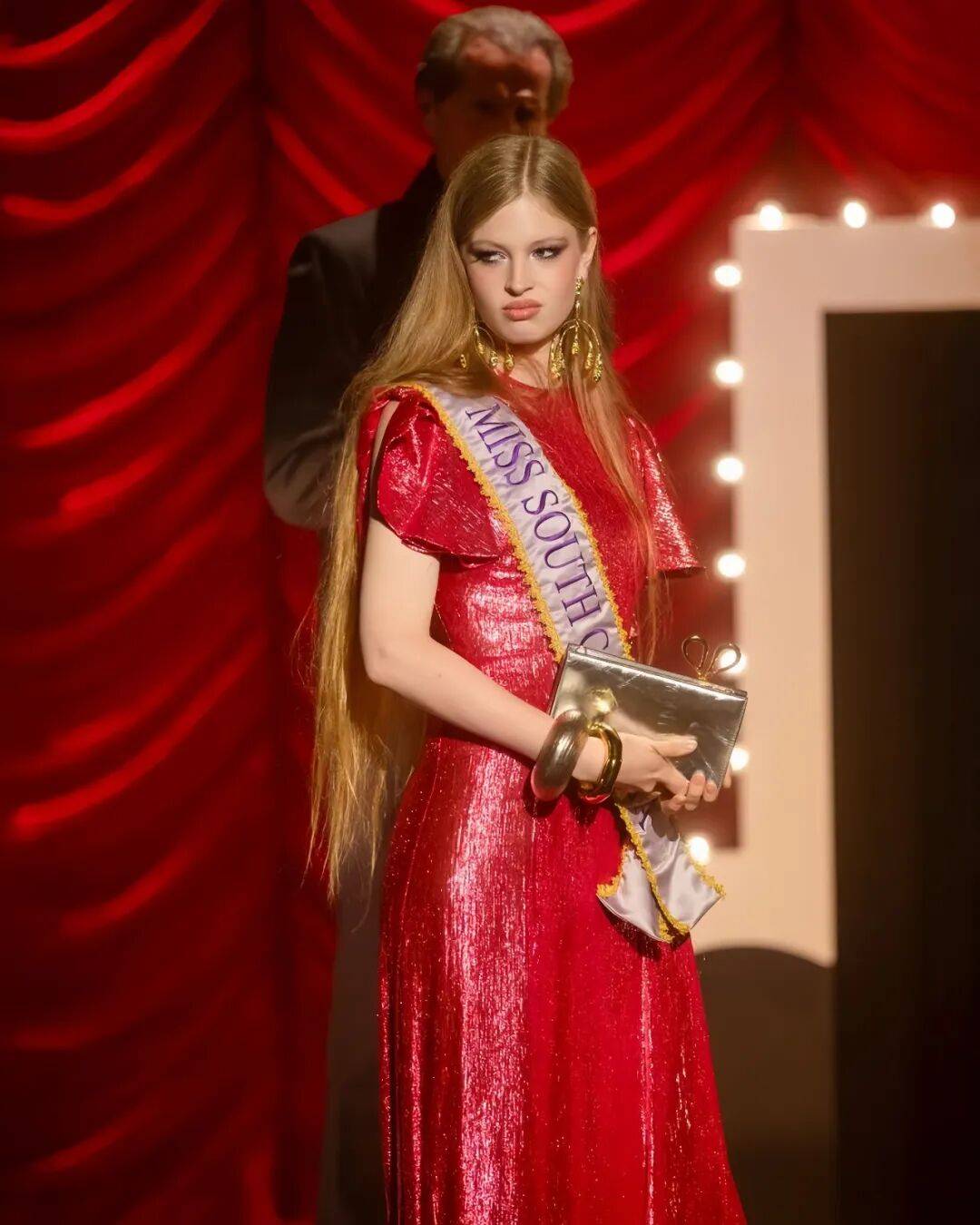 为 Alexis Bittar 走秀,她身穿红裙,化身为参加美国小姐选美的金发女郎。▼