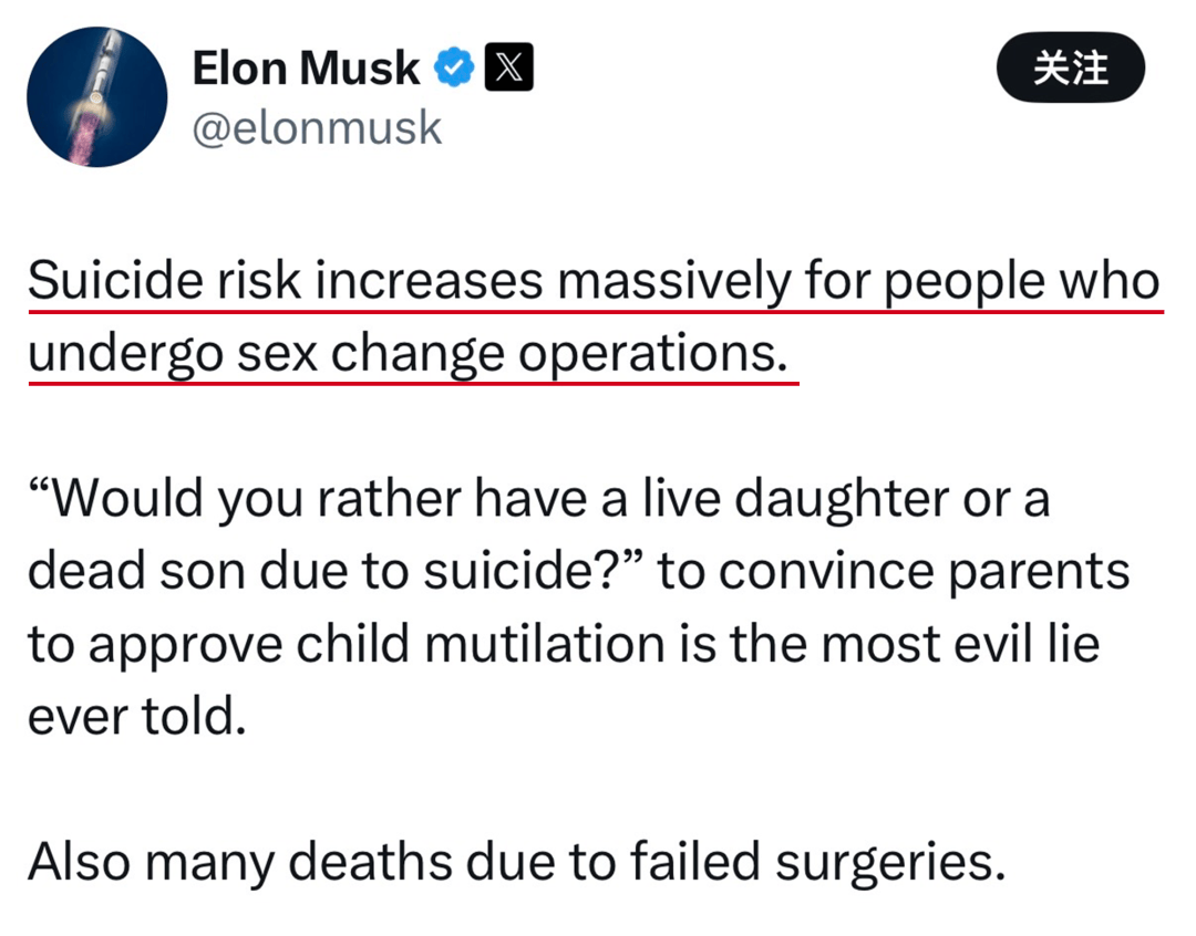 简而言之,对马斯克而言,共情和支持一个跨性别者,就等会一定会让自己的孩子跨性别。这个逻辑错误名为滑坡谬误(Slippery slope),属于网络上键盘侠经常踩的坑,马斯克也踩,就很难评。▼