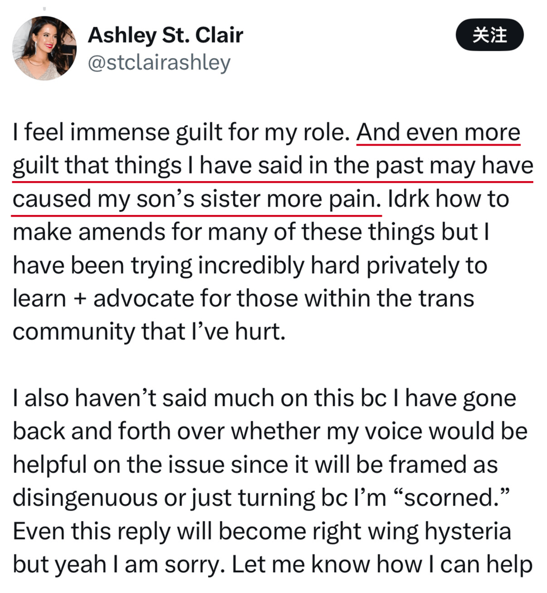 “我为自己的所作所为感到深深的愧疚。尤其让我内疚的是,过去说过的话可能给我儿子的姐姐带来了更多痛苦。